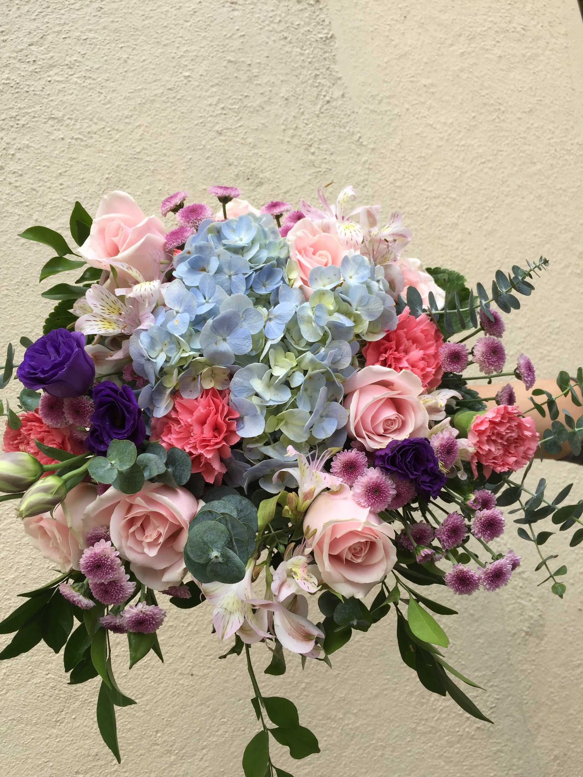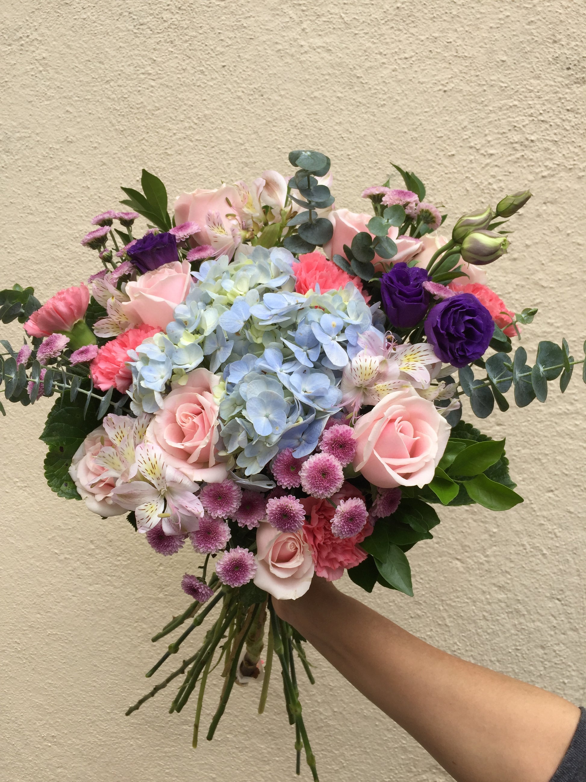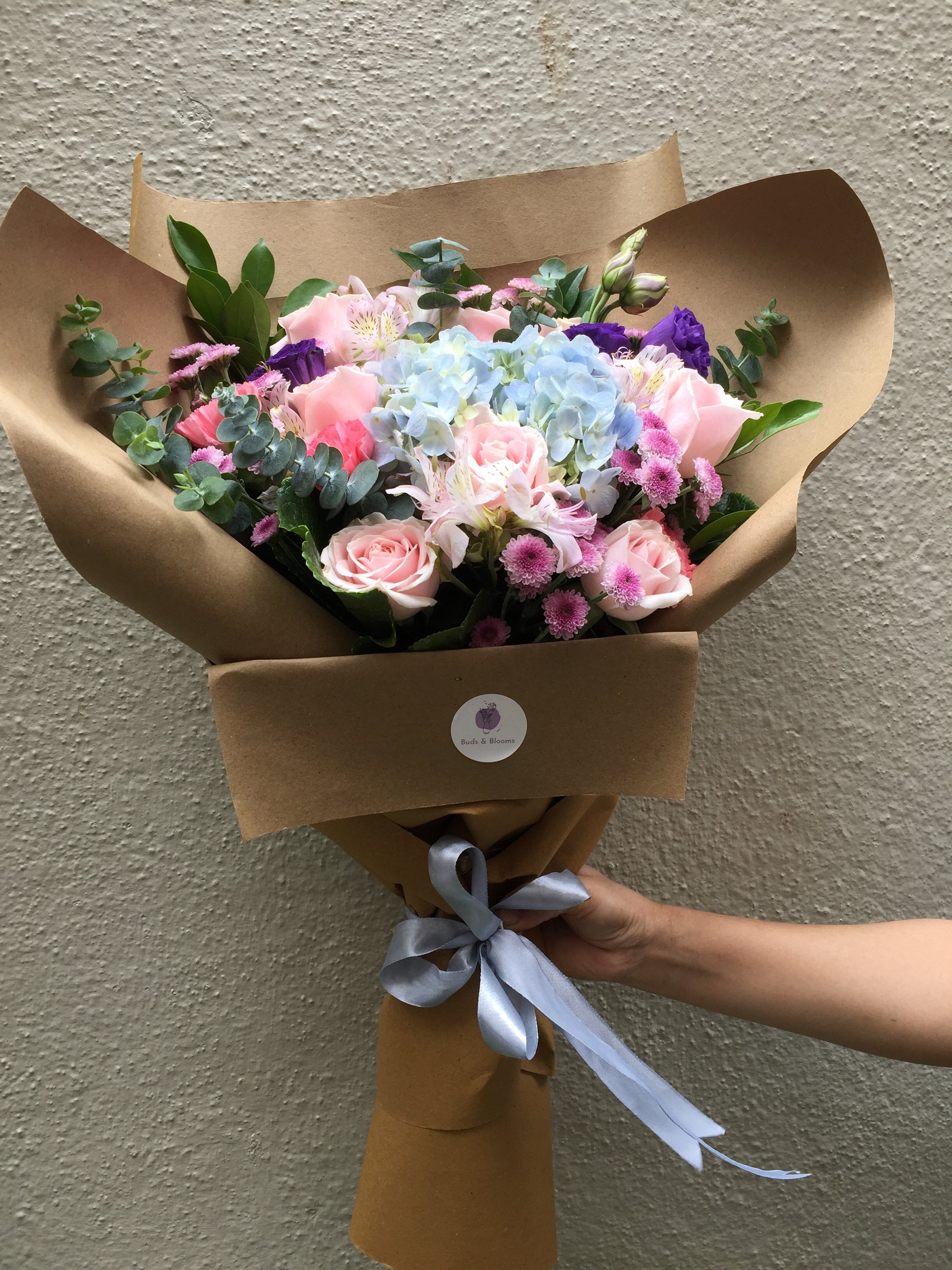 Flower Type: Pink Carnation, Blue Hydrangea, Sweet Availlance, Purple Eustoma, Button Chrysanthemum,Alstromeria,'Kamini, Baby Dollar.