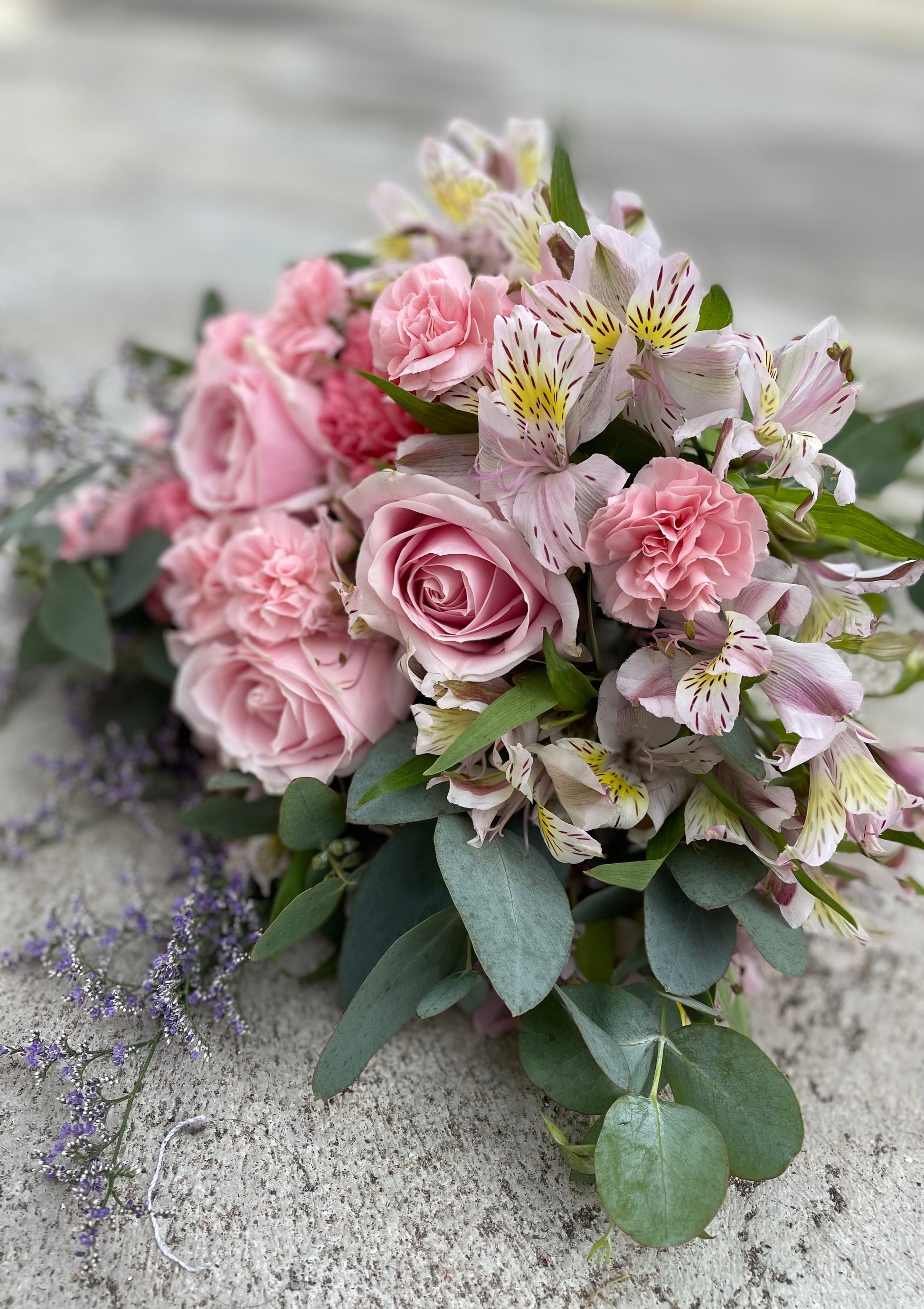 Flower Type: Pink Rose, Pink Carnation, Pink Alstroemerias&white alstromerias, Limonium, Eucalyptus