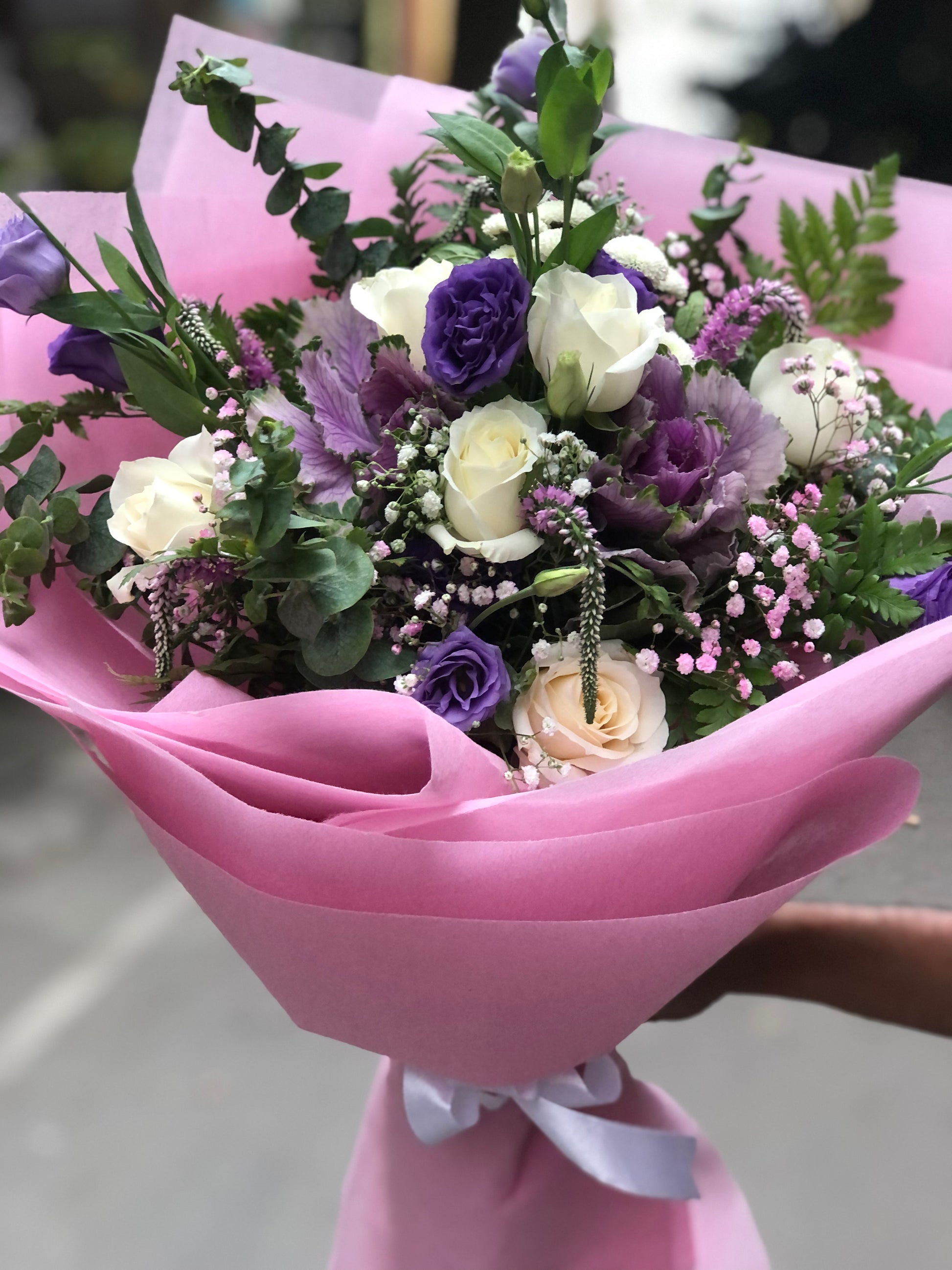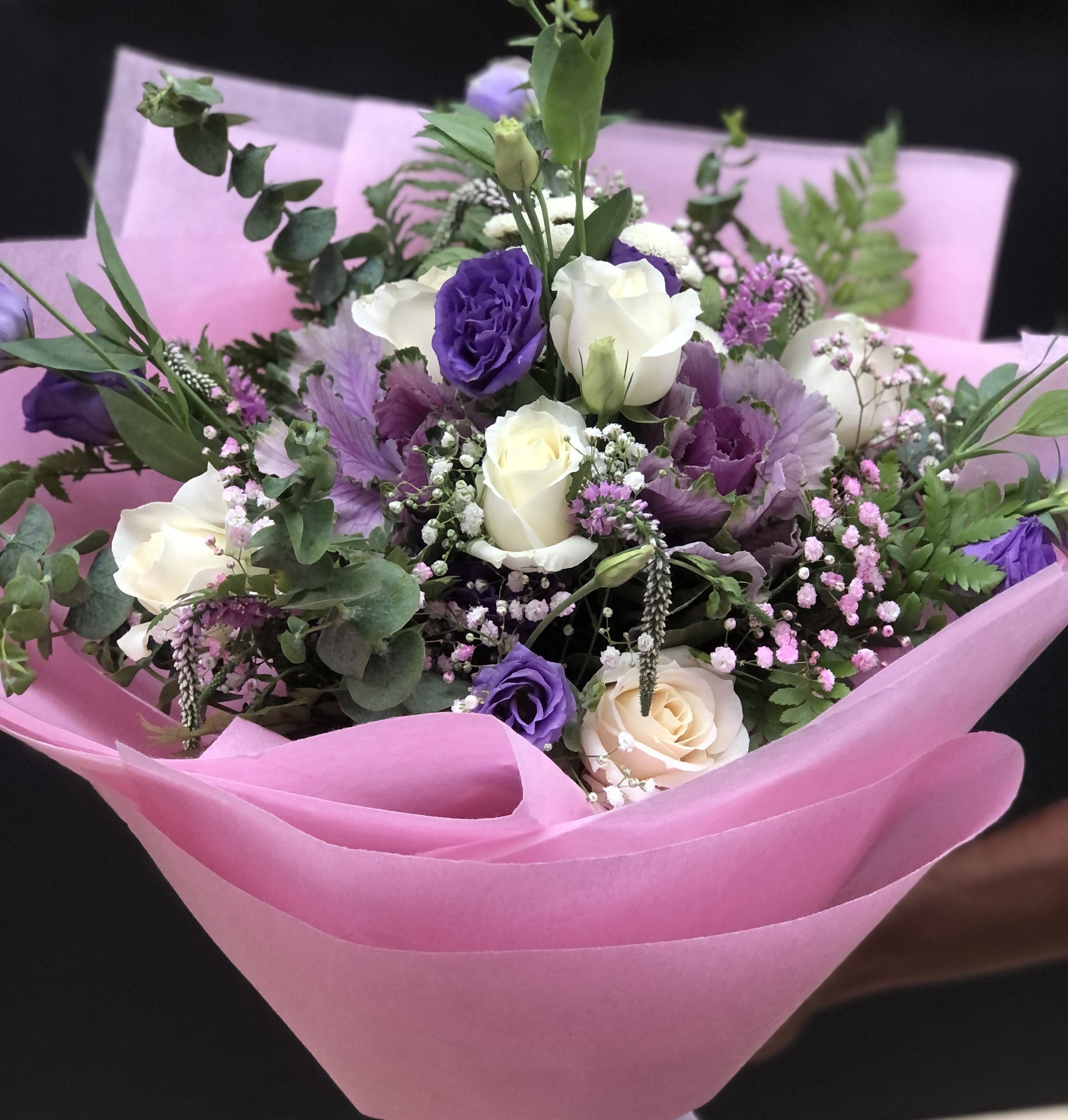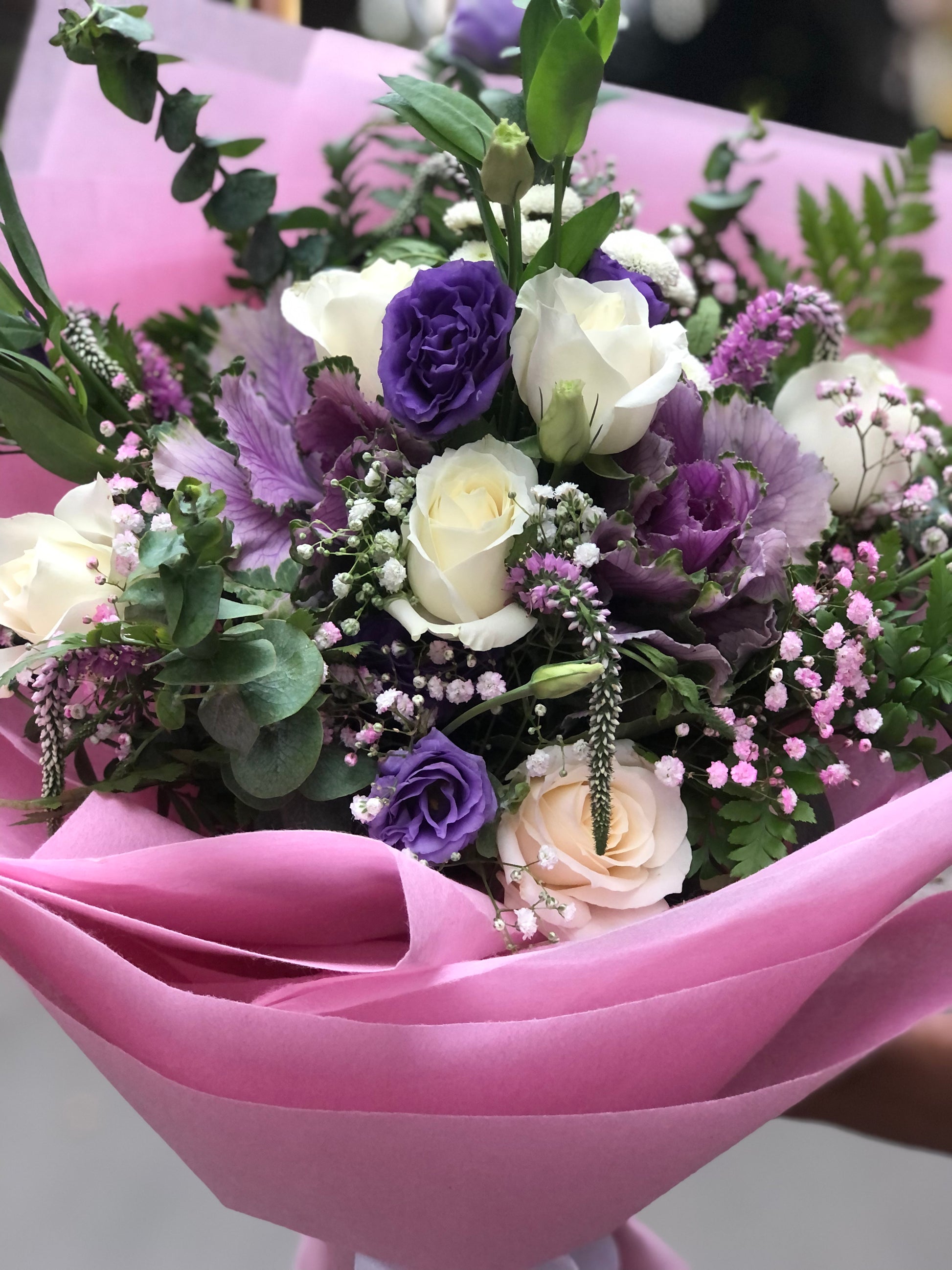 Flower Type: Bressica, lisianthus, Baby's Breath, white rose, Eucalyptus, fillers