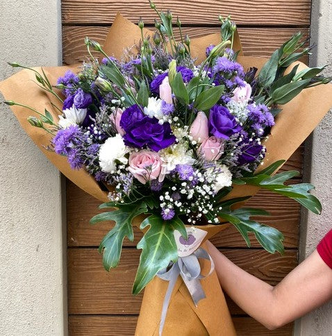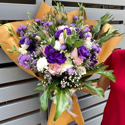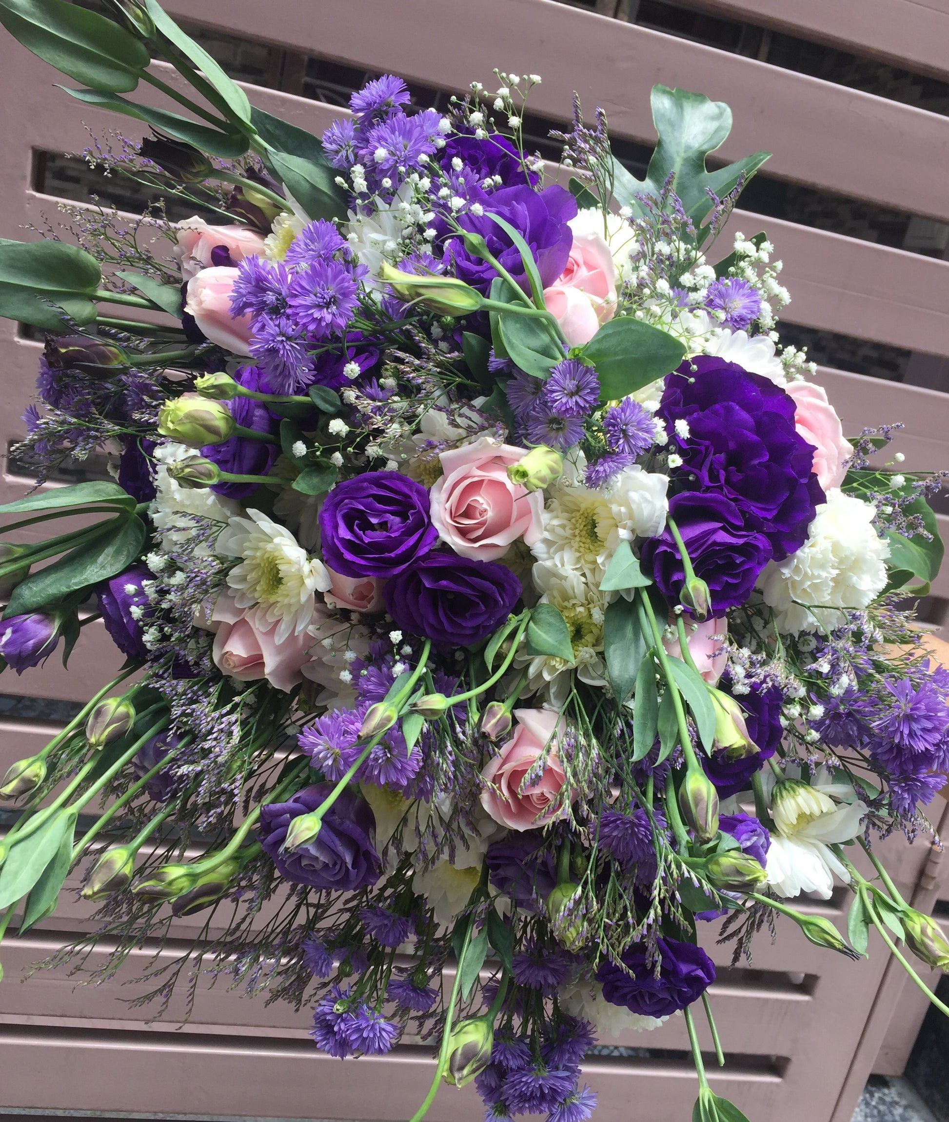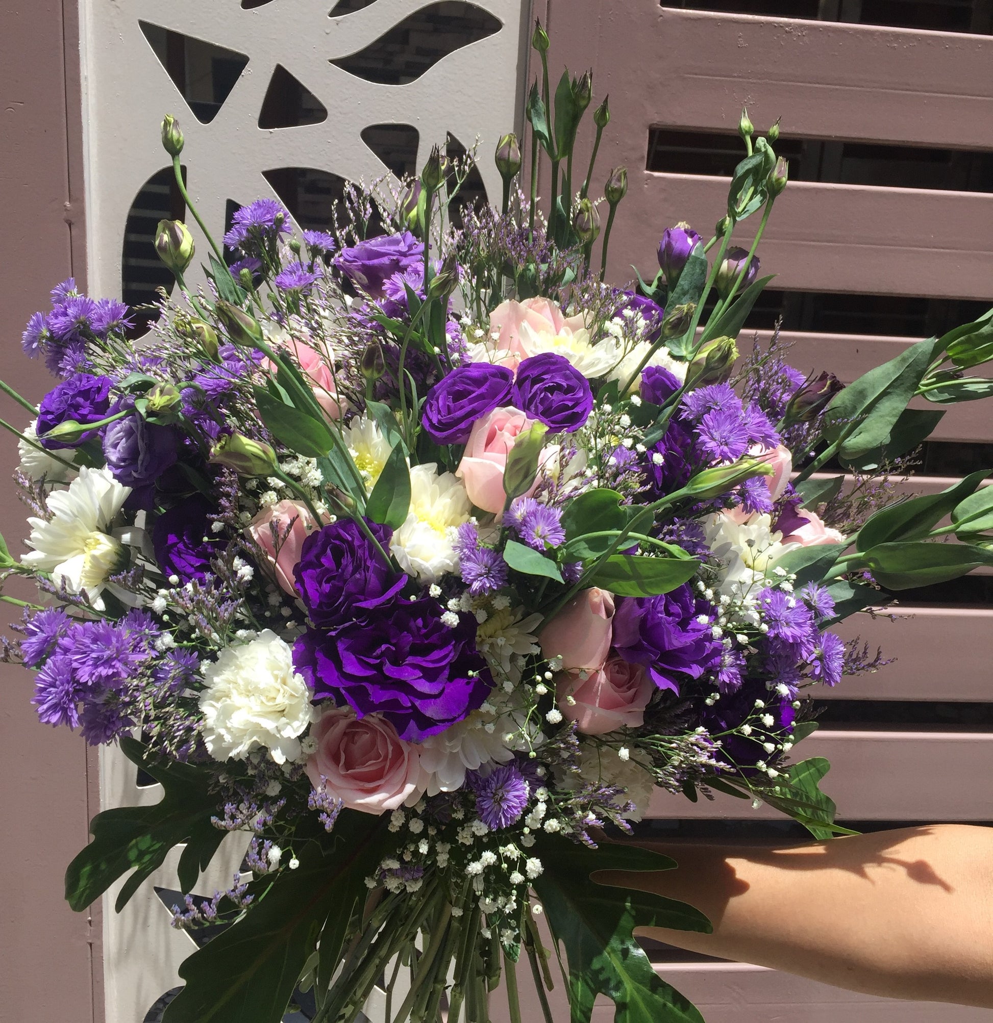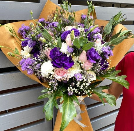 Flower Type: Purple Eustoma, Sweet Rose, White Chrysanthemum, Bluedaisy, Limonium, Janada levees