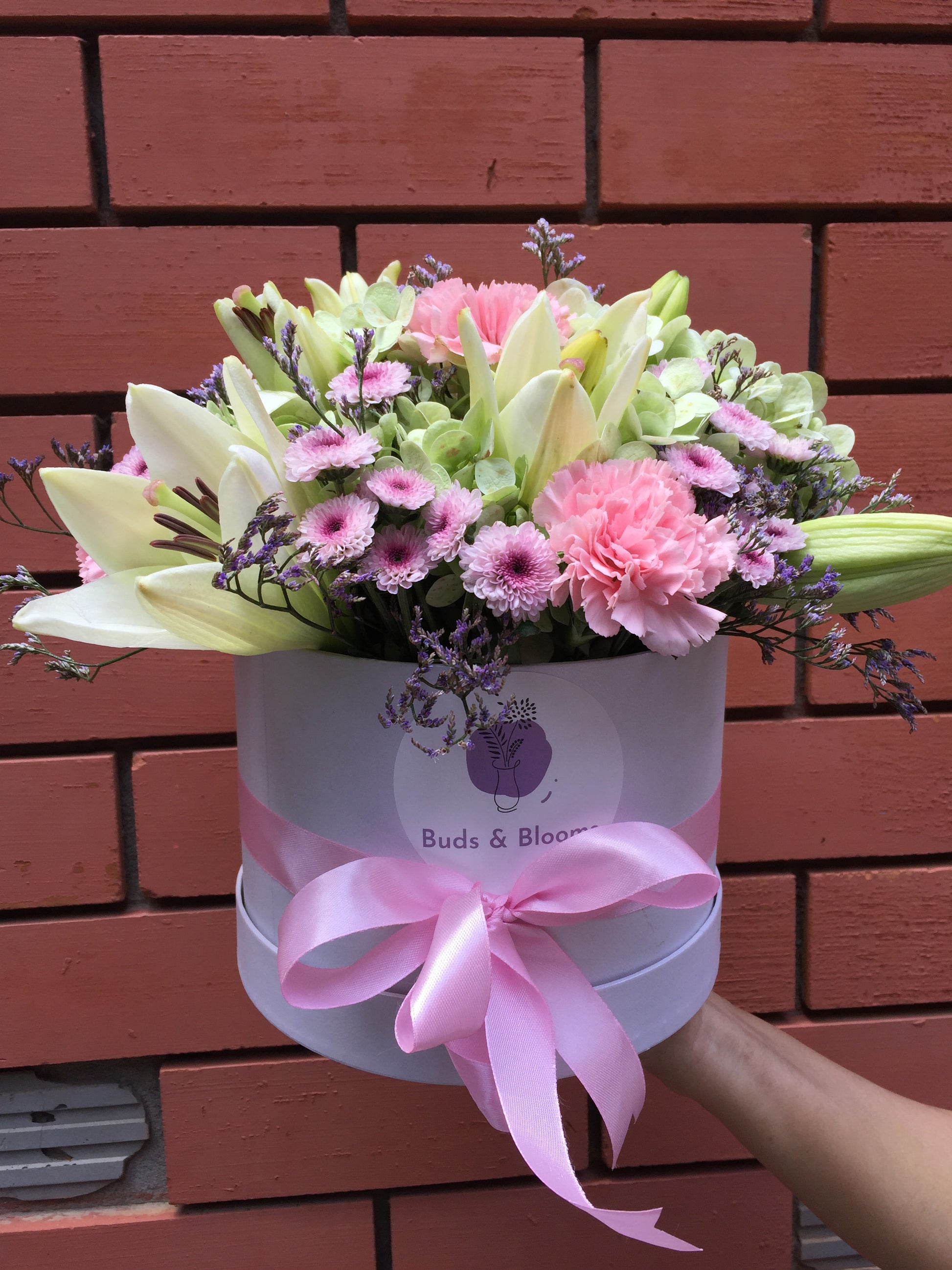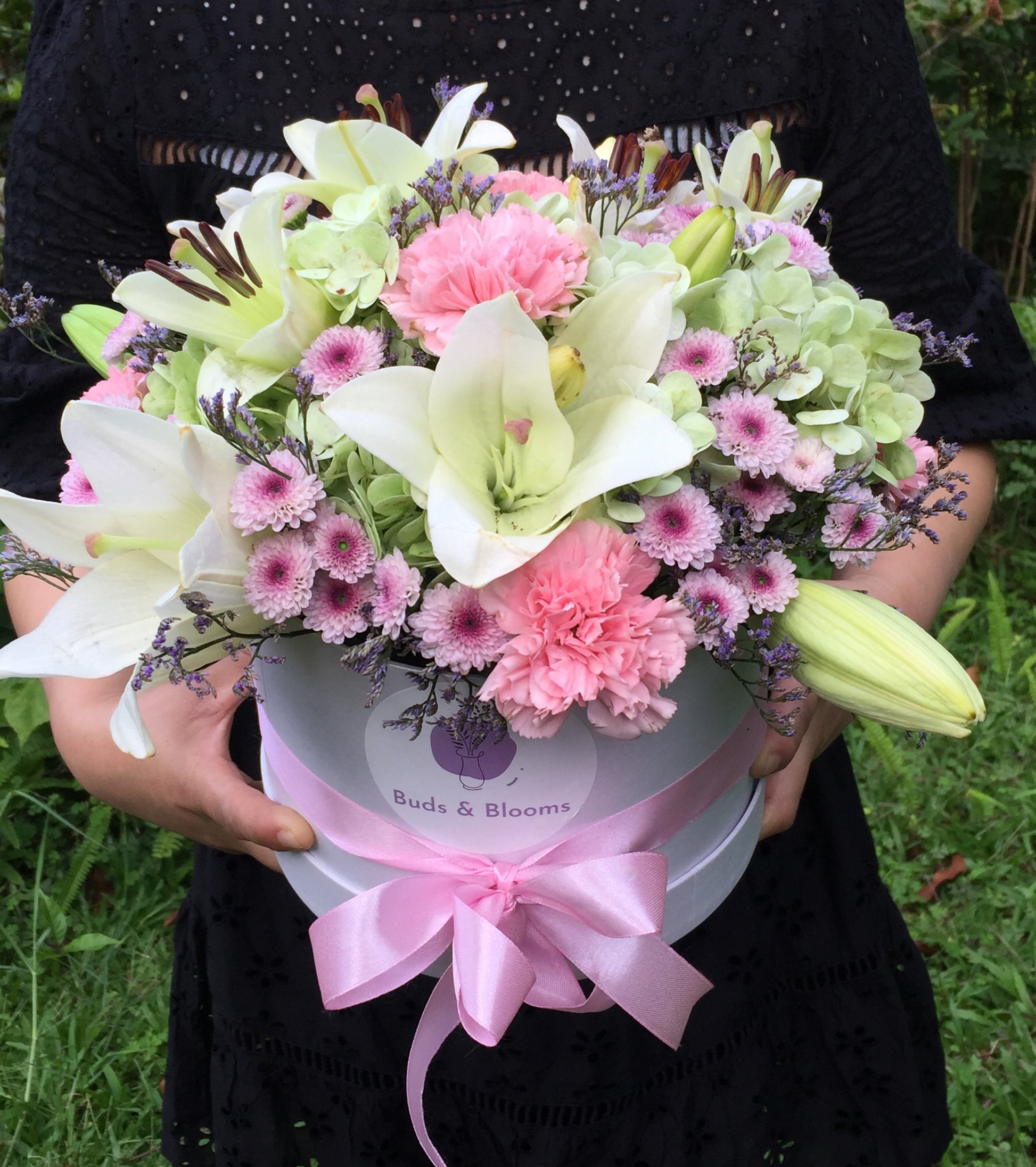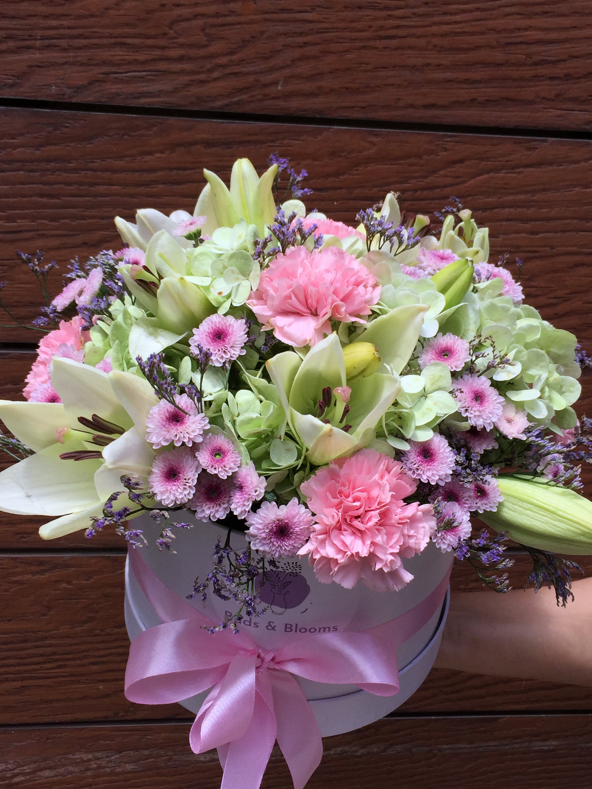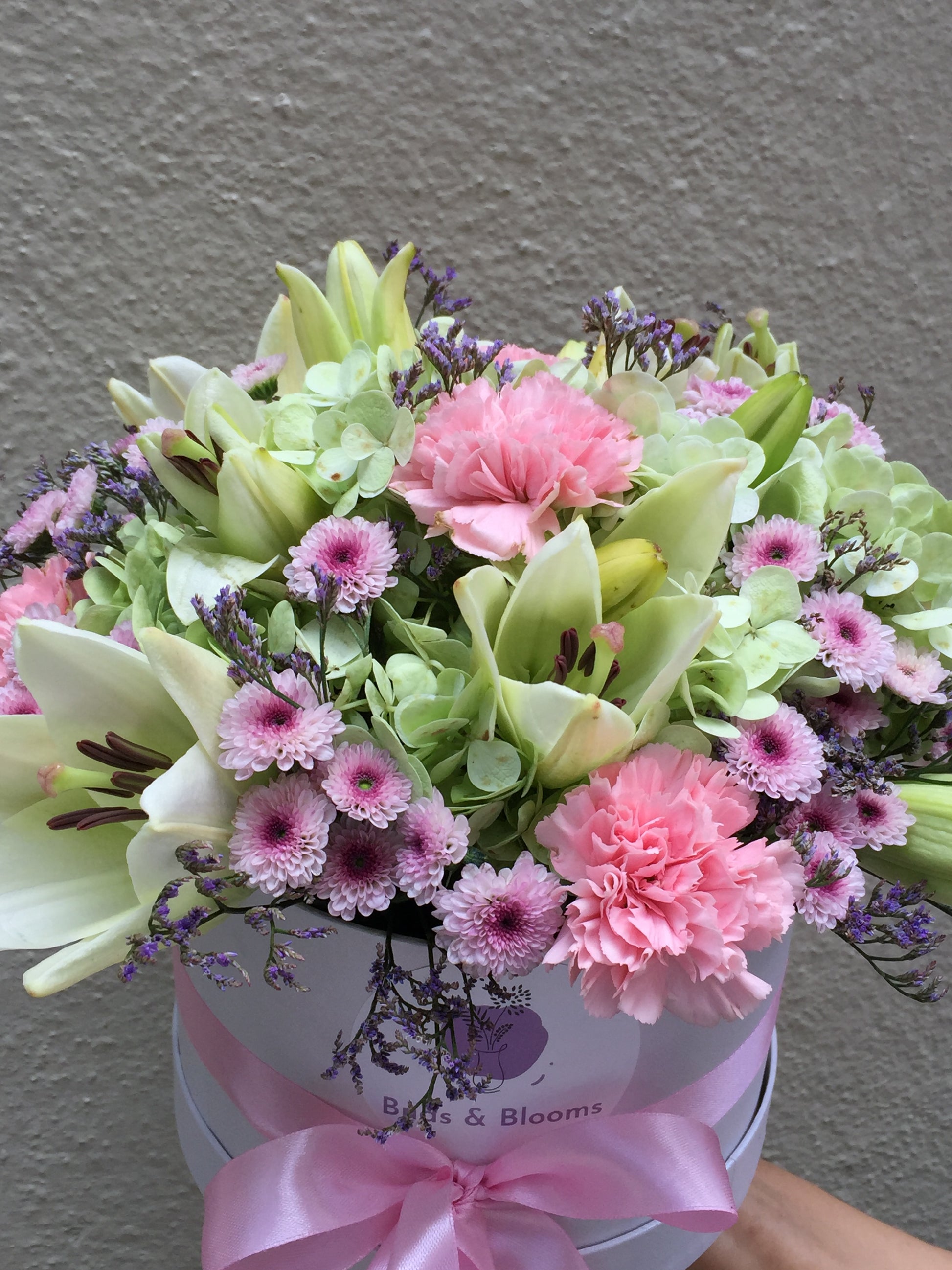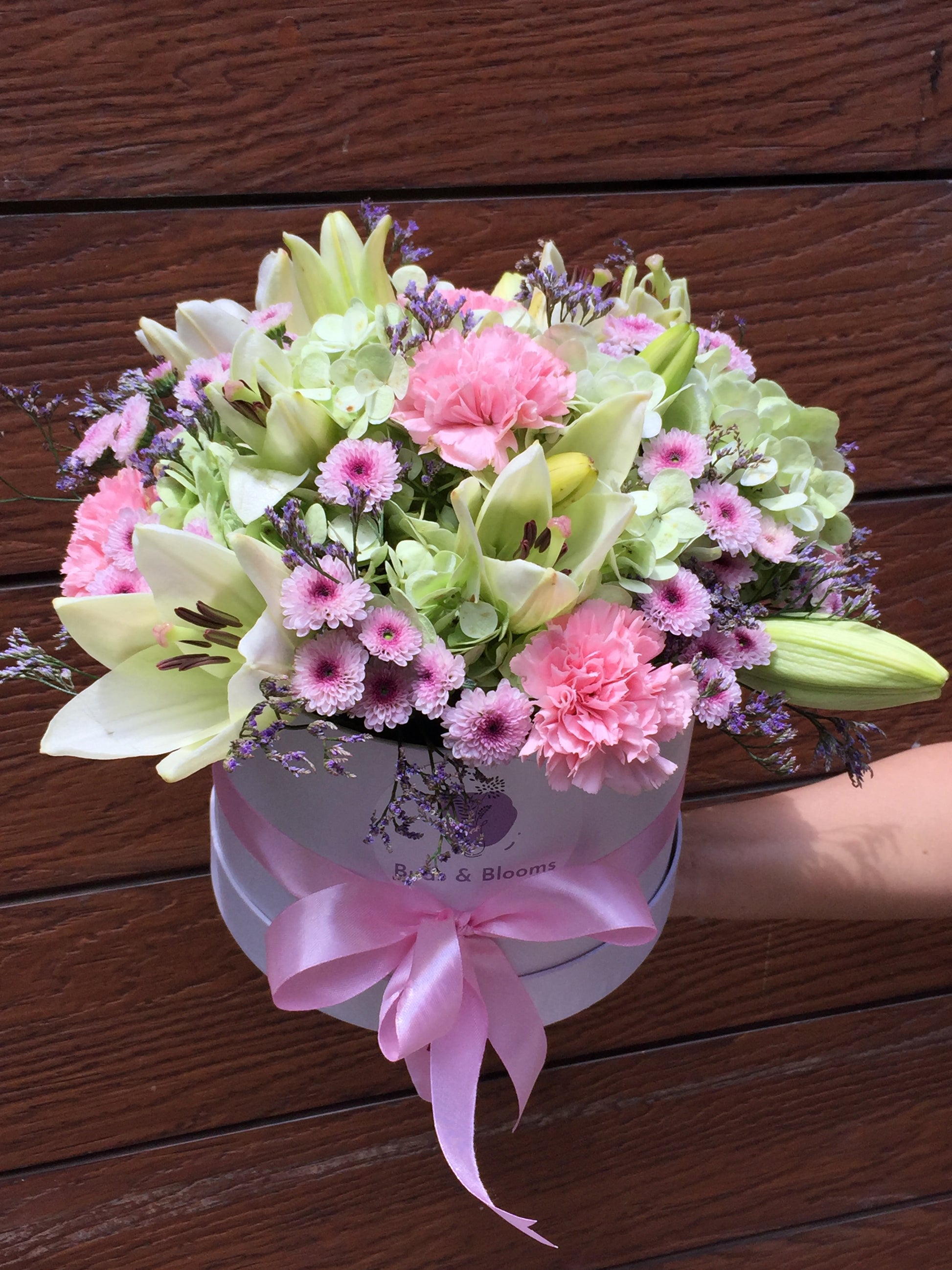 Flower Type: Lilies, Green Hydrangea, Pink Button Chrysanthemums, Carnations, Limonium
