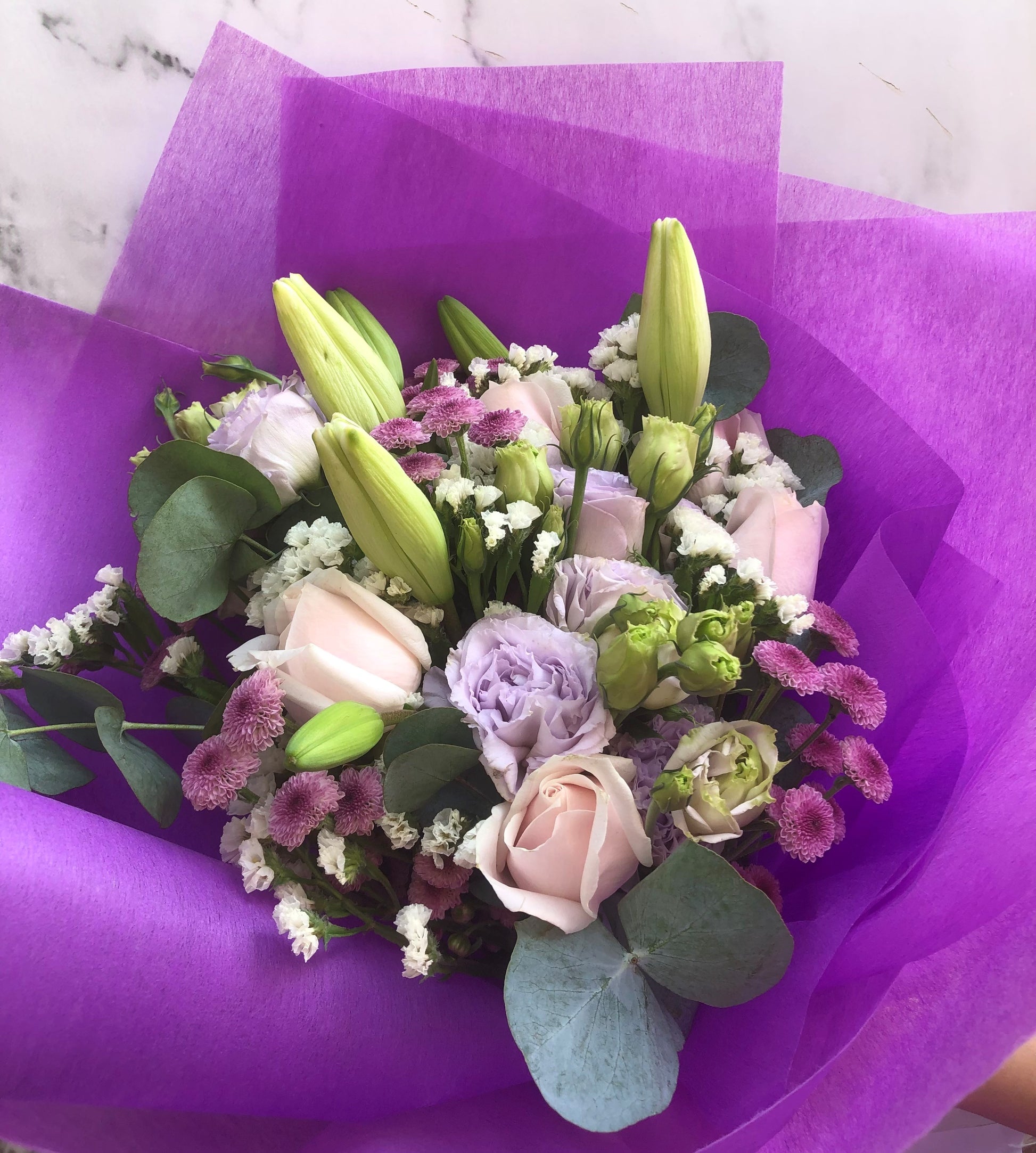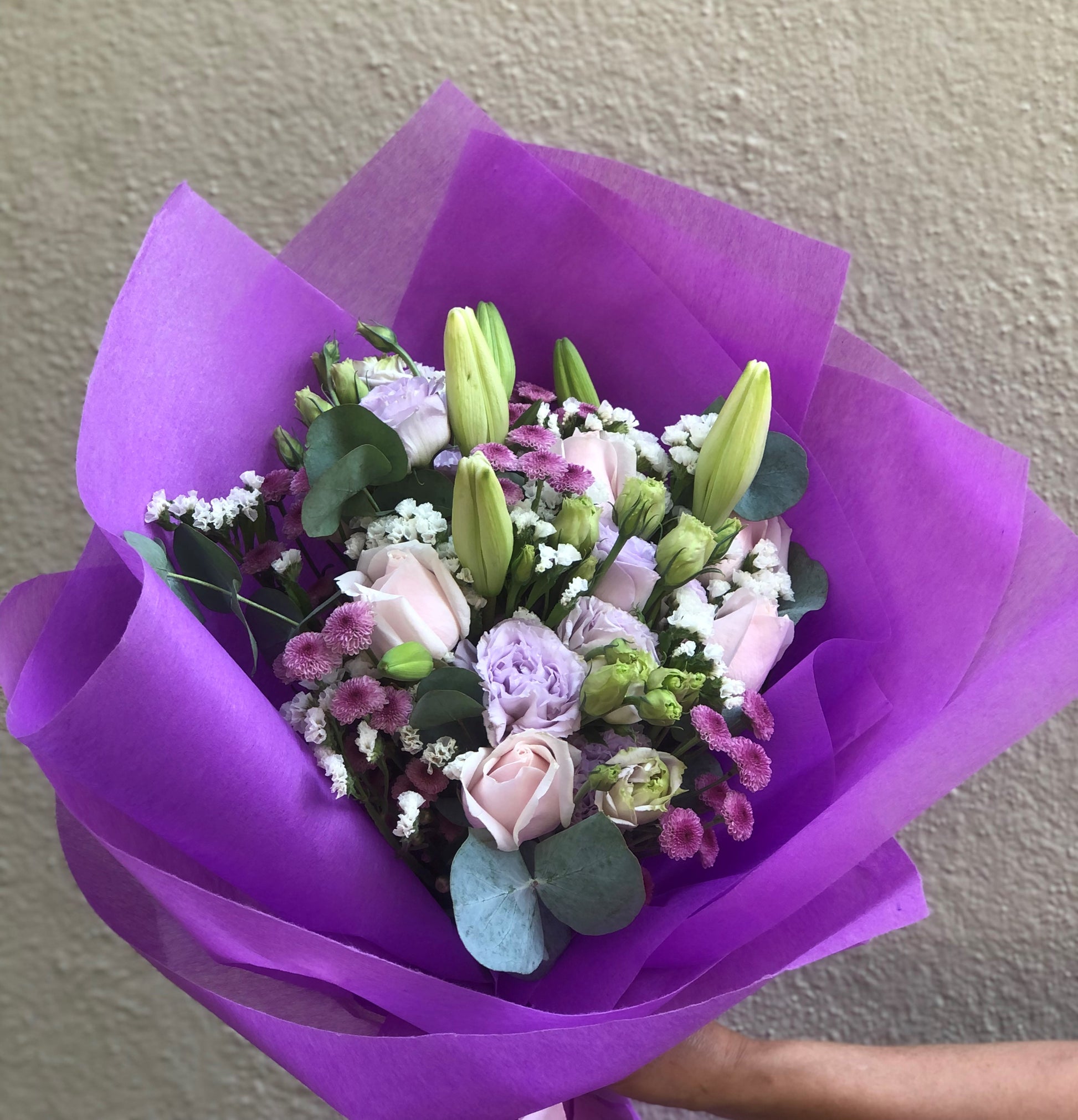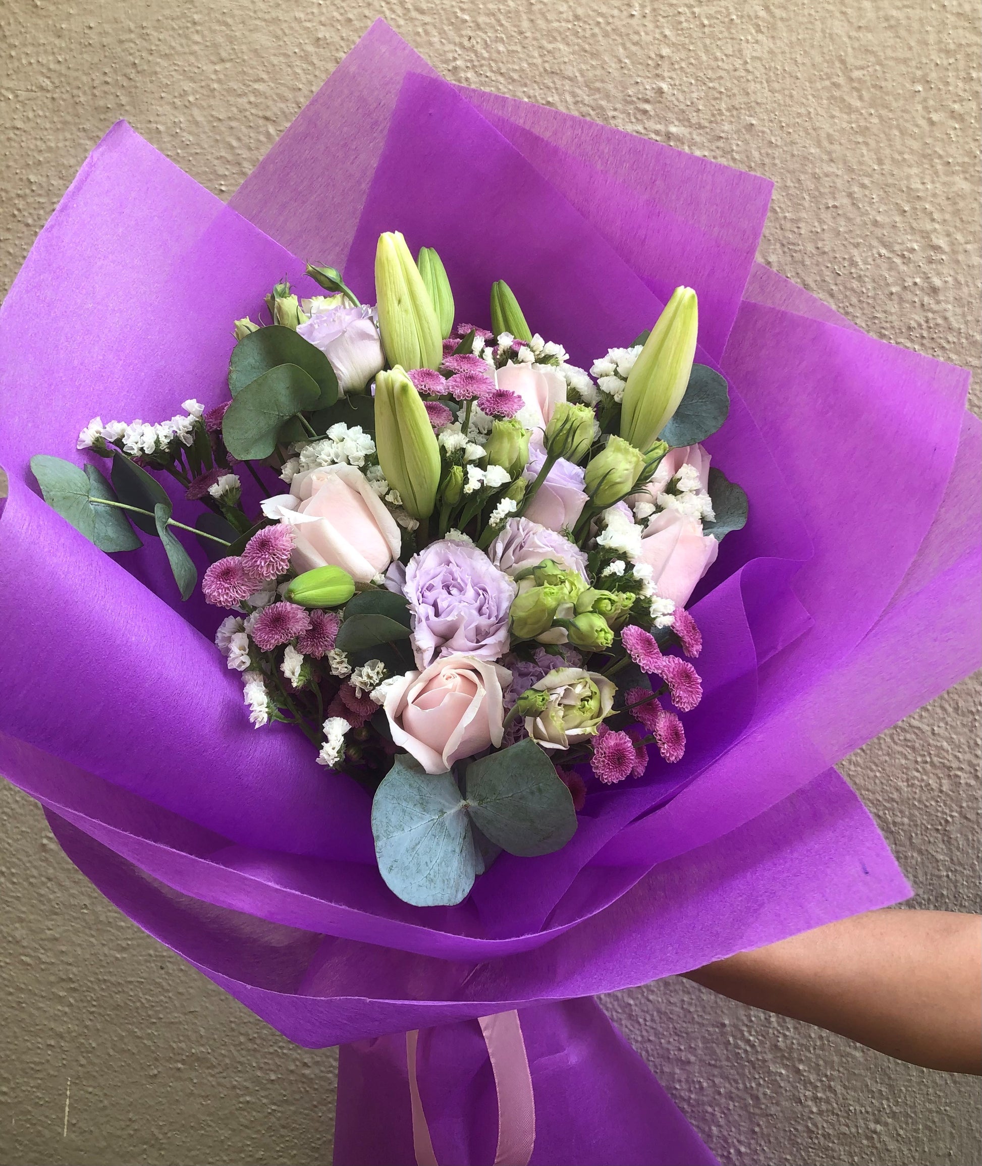 Flower Type: Lilies,Lisianthus,Mums chrysanthemum,Sweet Availlance,Statice and Eucalytus.