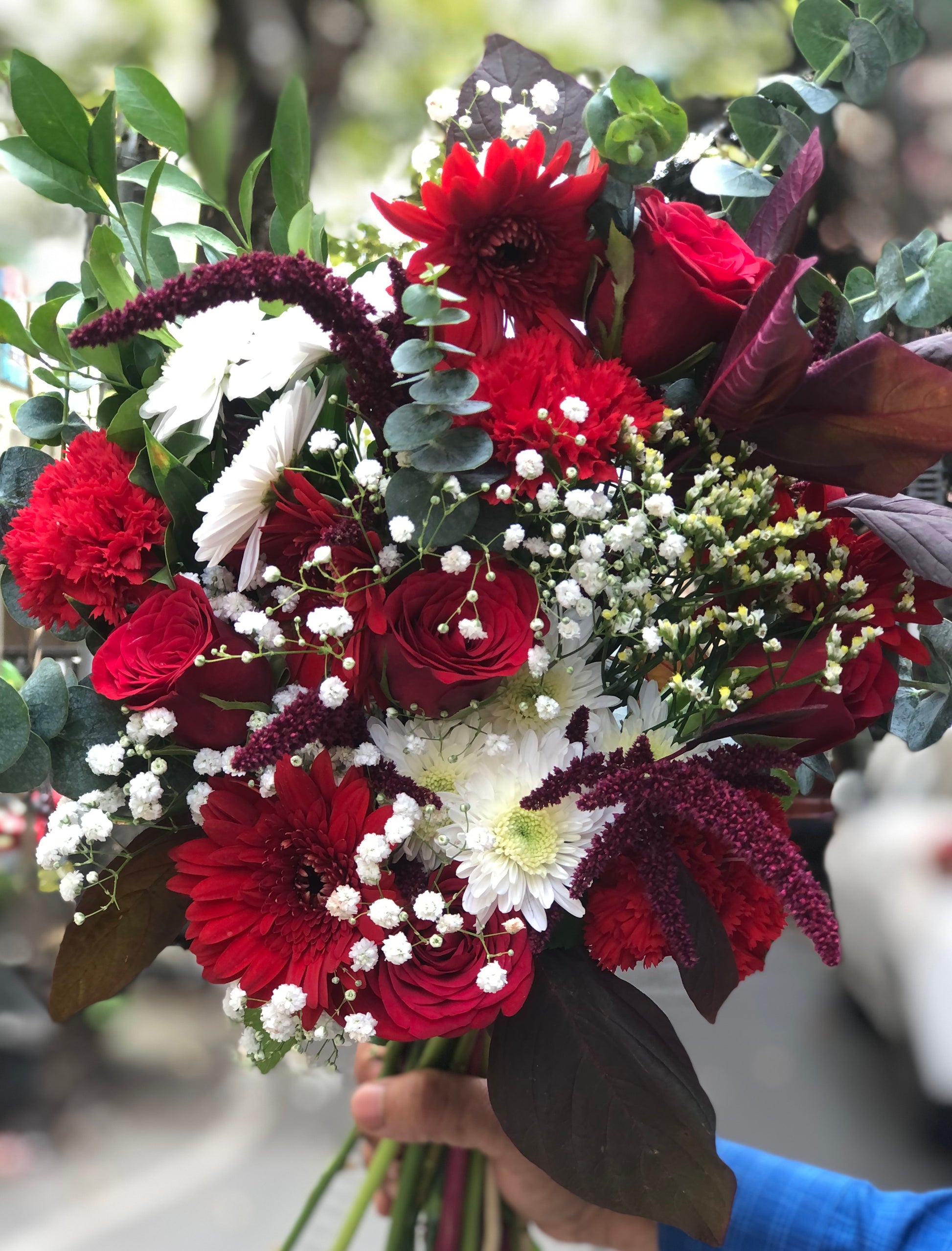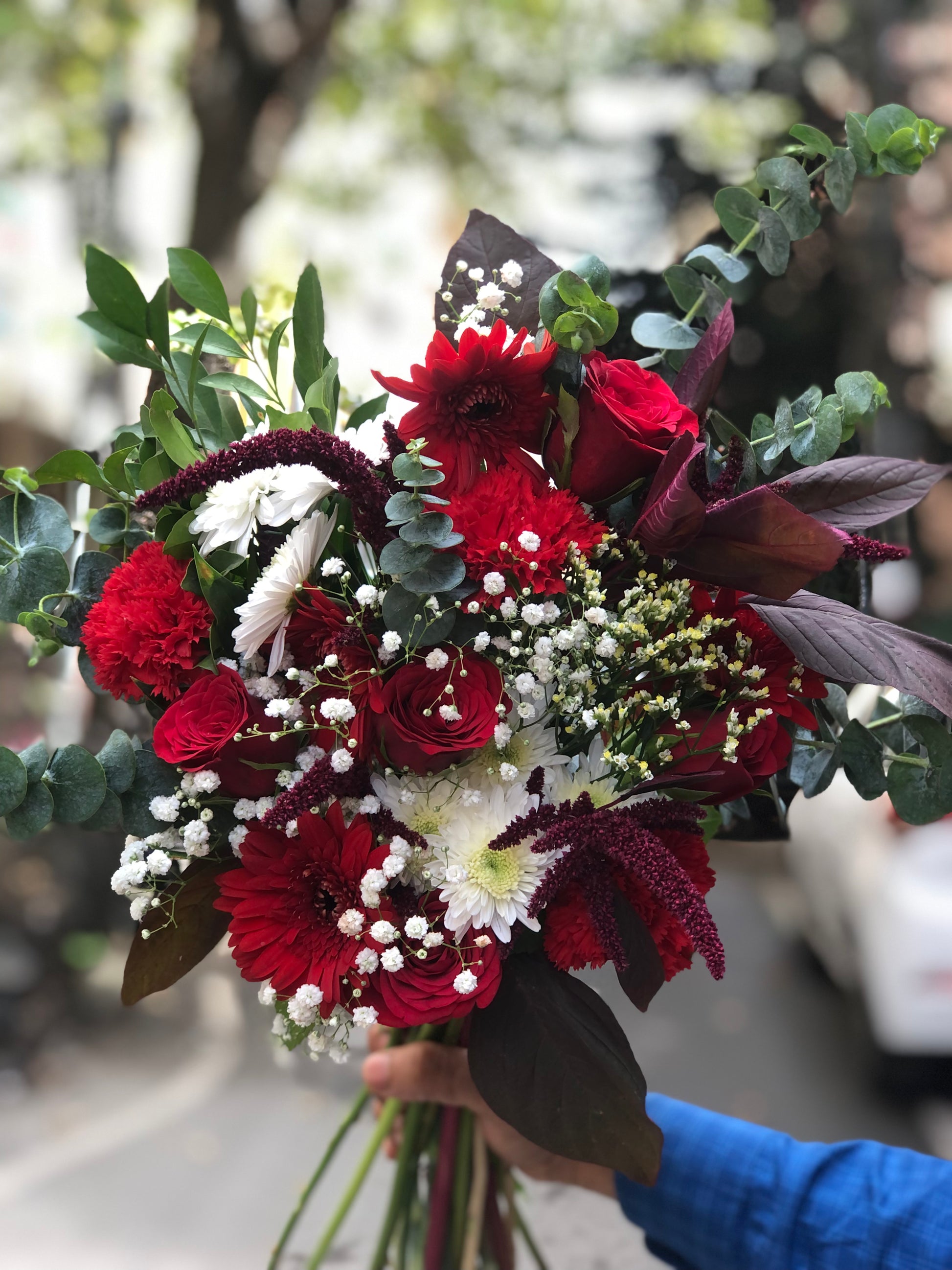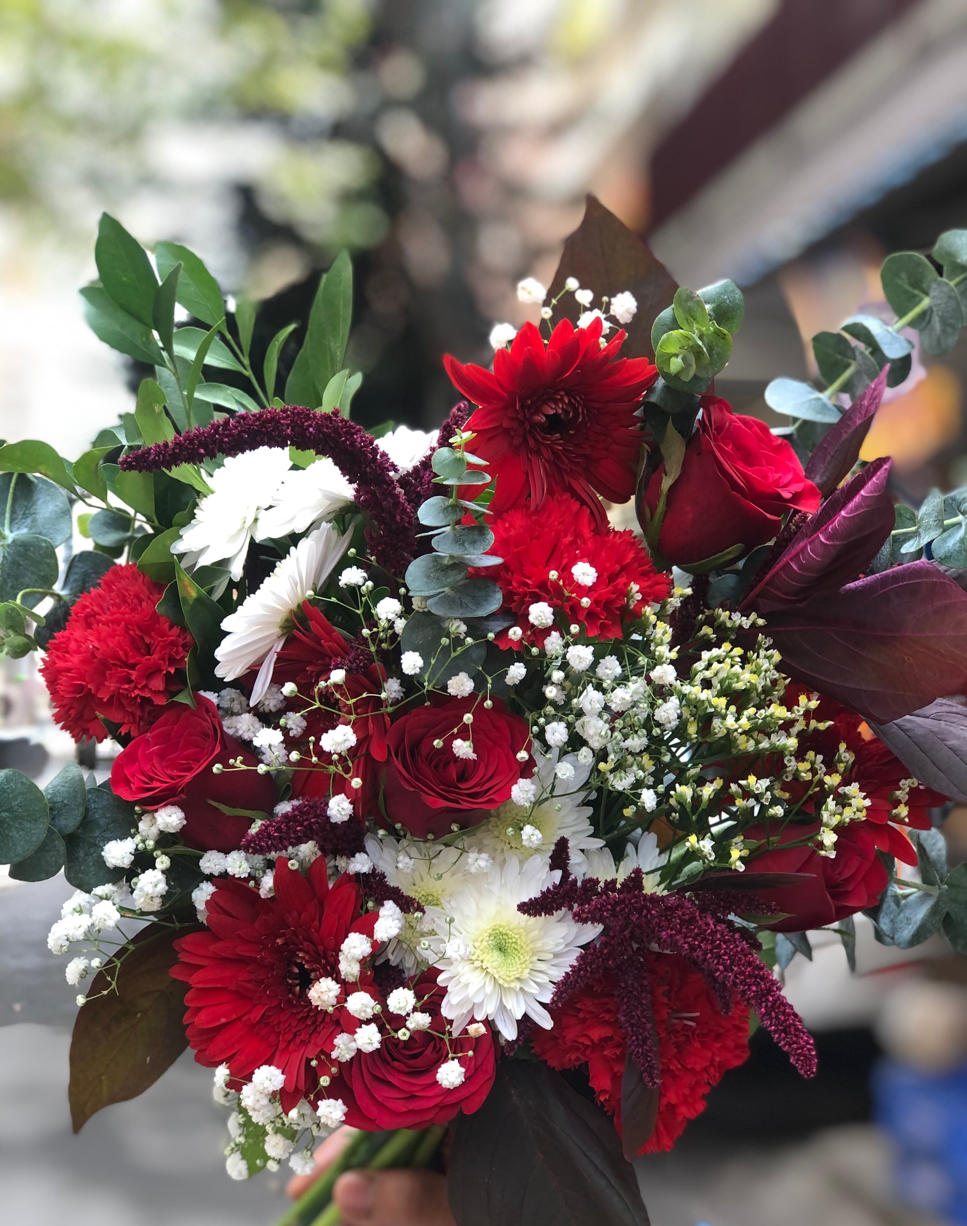 Flower Type: Amaranthus red, Gerbera red, red rose, limonium, white chrysanthemum, gypso, and Green fillers