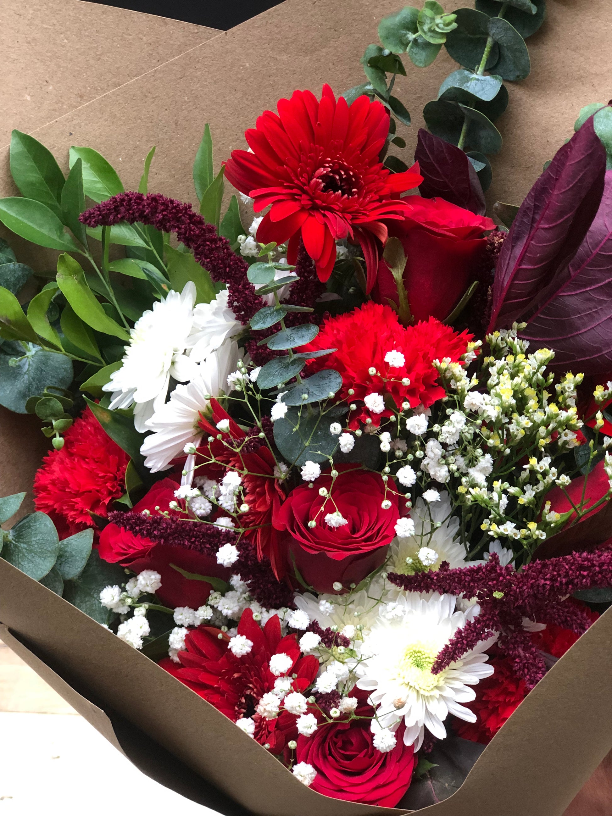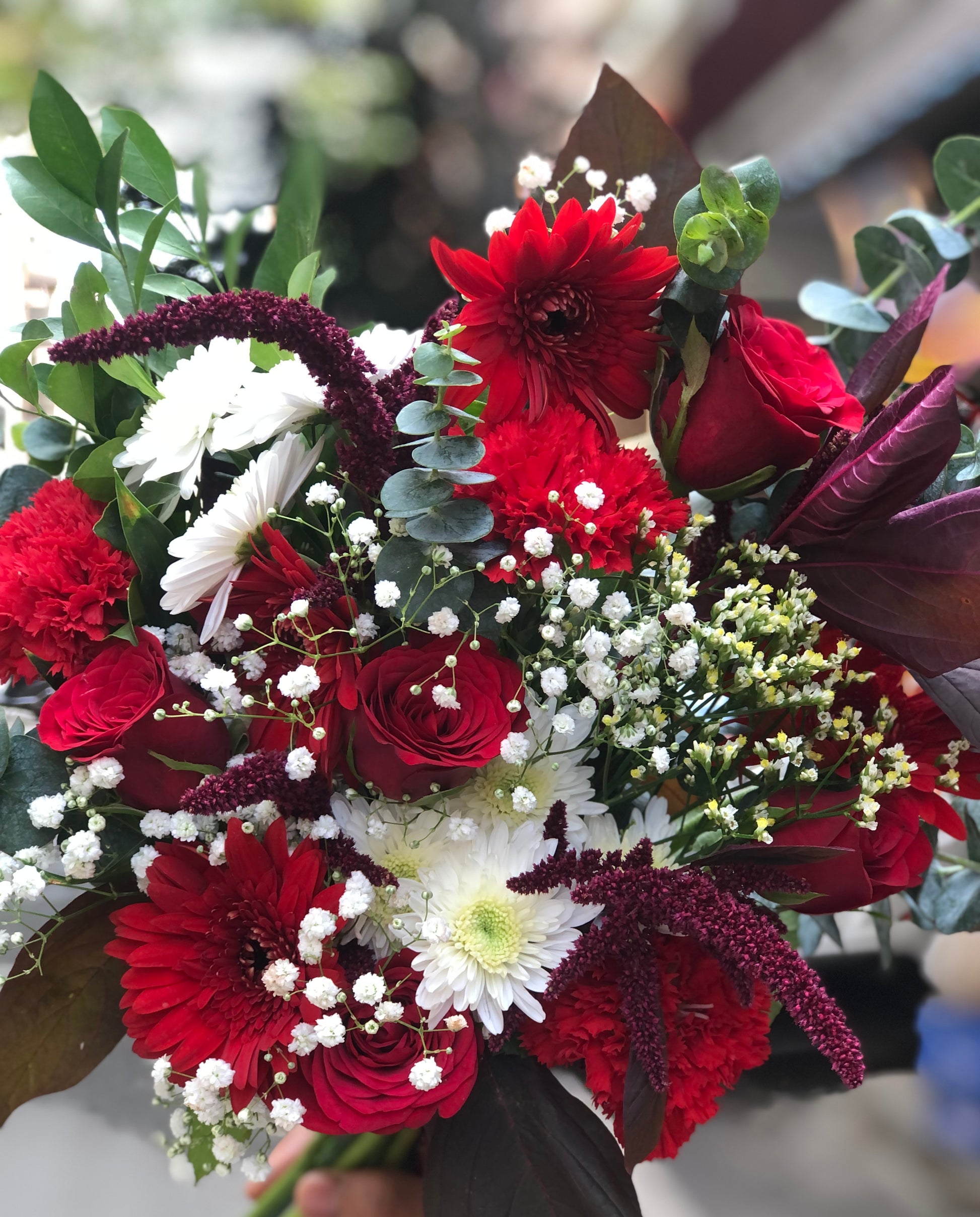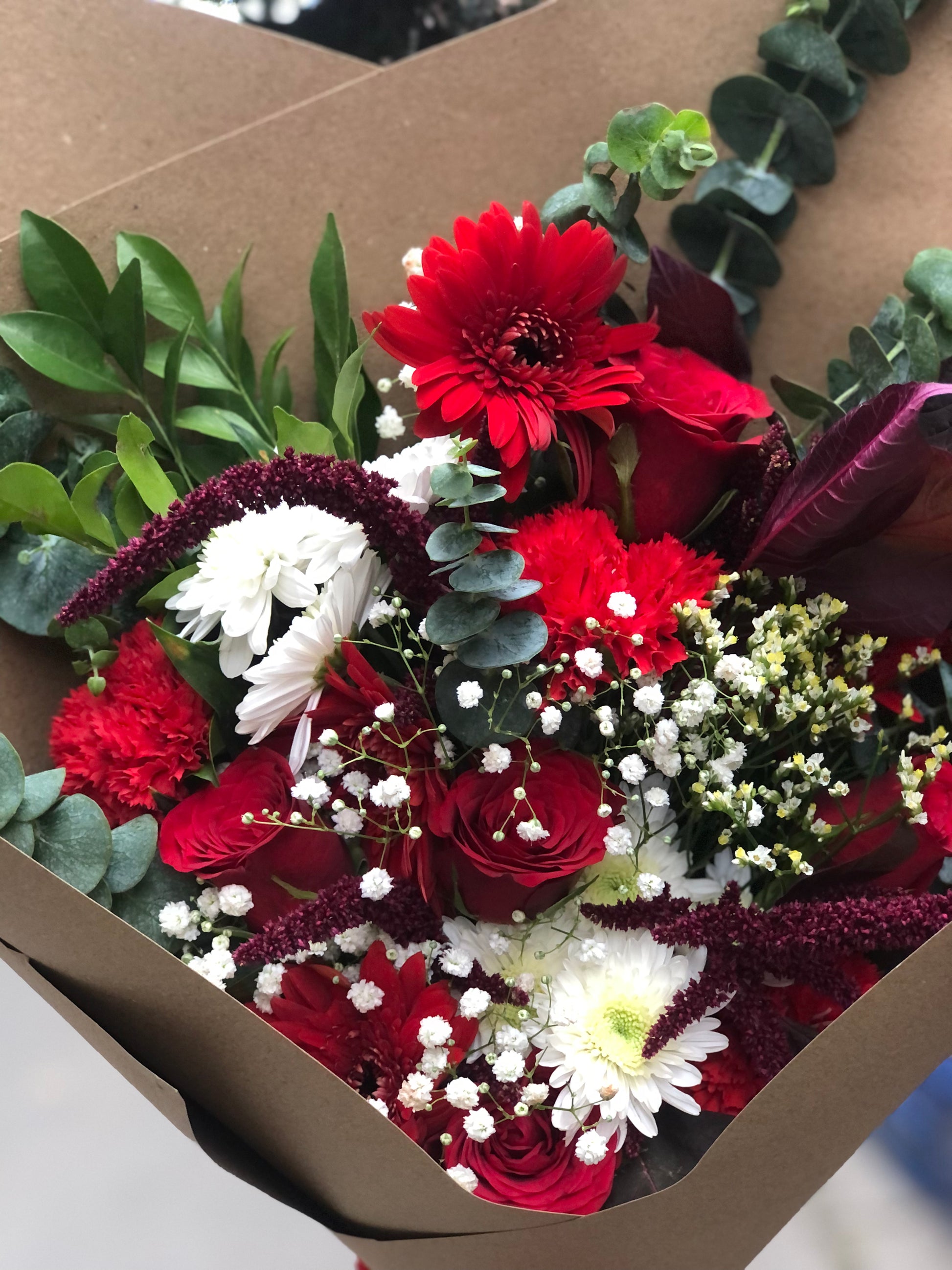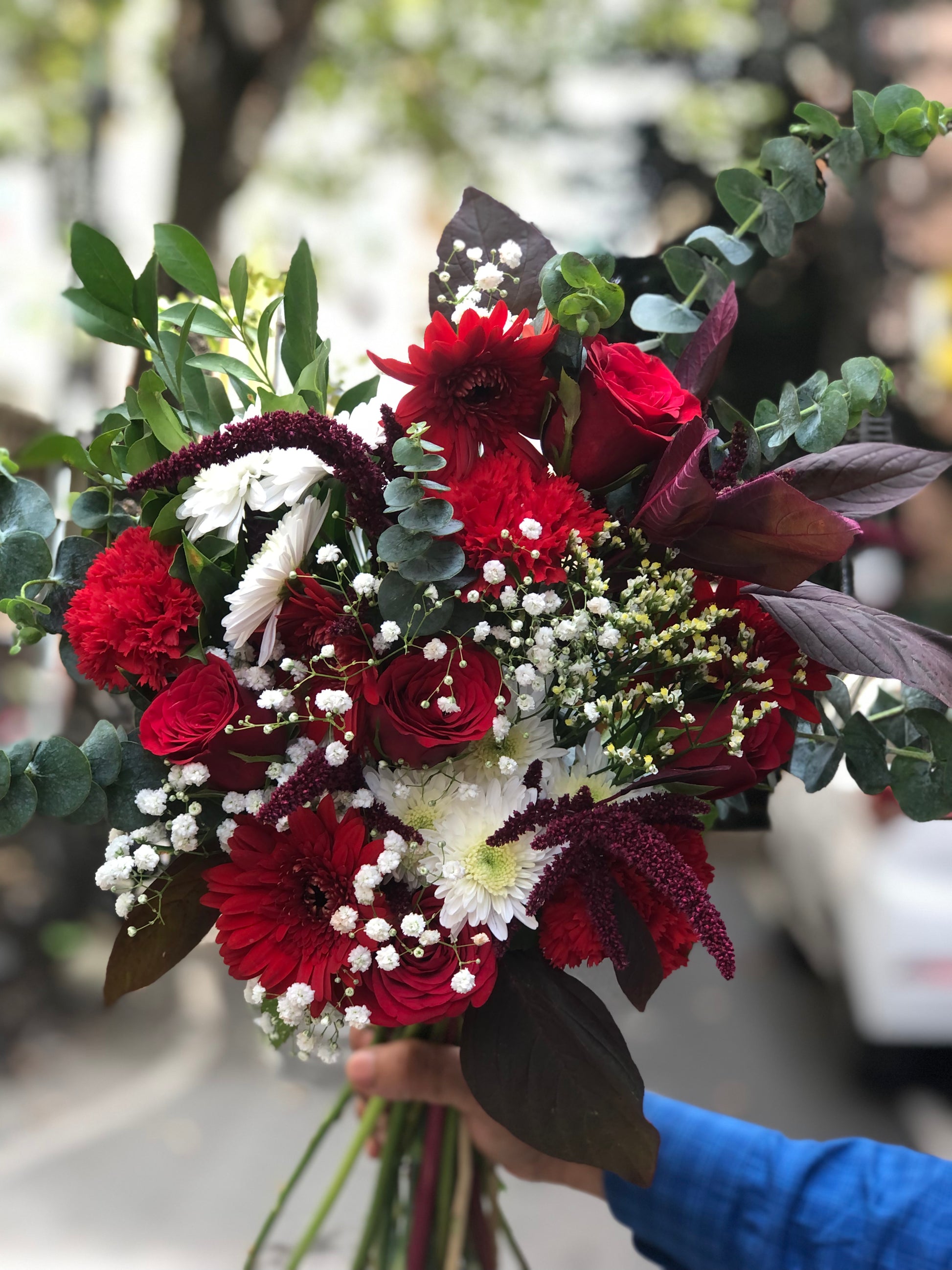 Flower Type: Amaranthus red, Gerbera red, red rose, limonium, white chrysanthemum, gypso, and Green fillers
