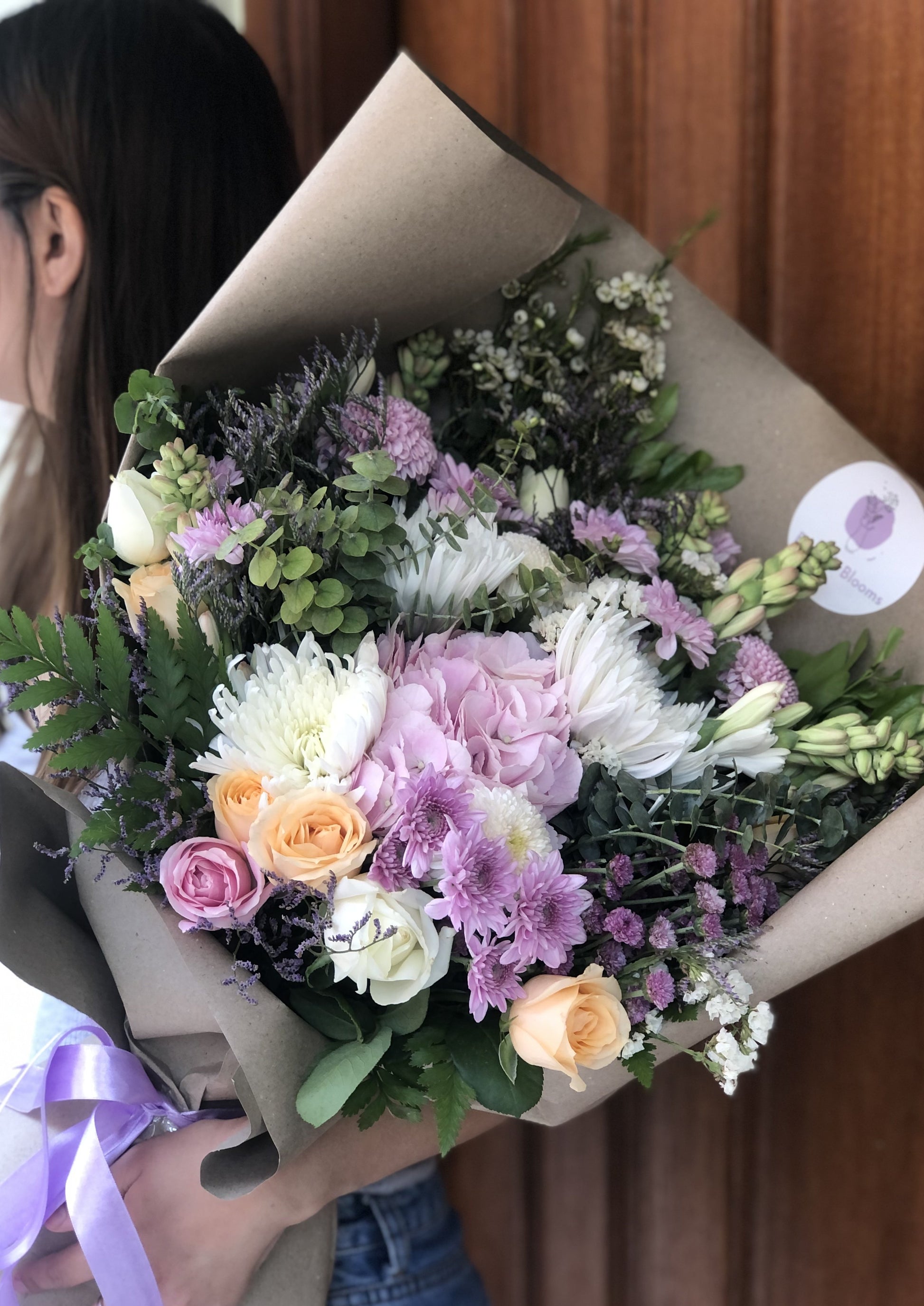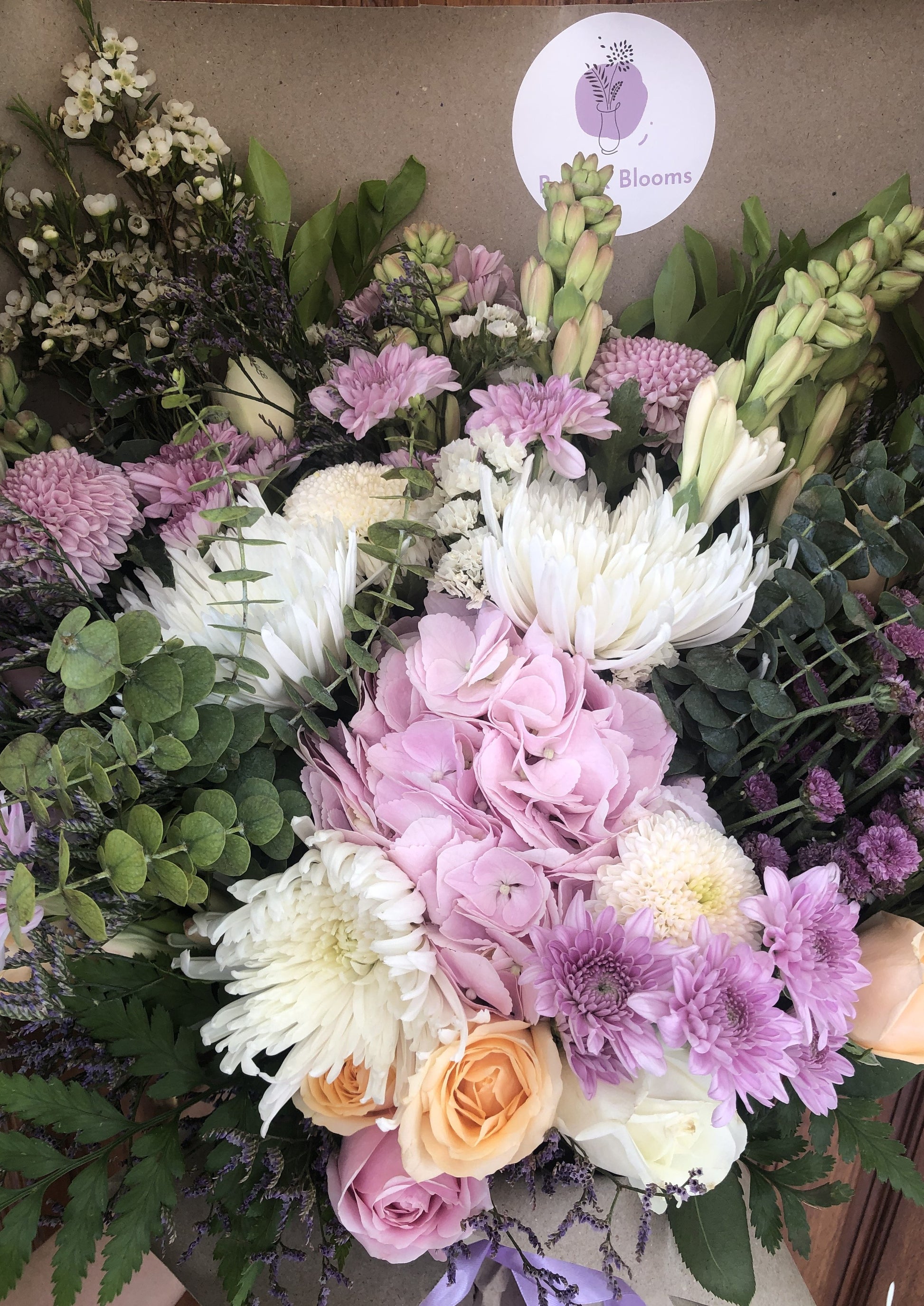 Flower Type: Pink Hydrangea, Mums Chrysanthemum, White Disbud, Tuberose, Leather Leaf, Eucalyptus, Peach Rose, Pink Rose, White Rose, White Statice, Limonium