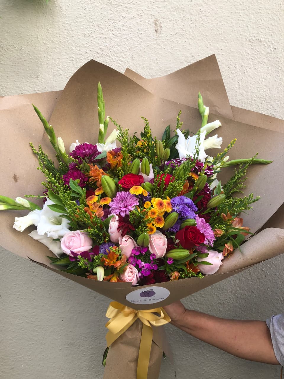 Flower Type: Gladiolus,red rose,red chrysanthemum Lily,sweet availlance,sweet Williams, orange button,orange alstromerias and fillers
