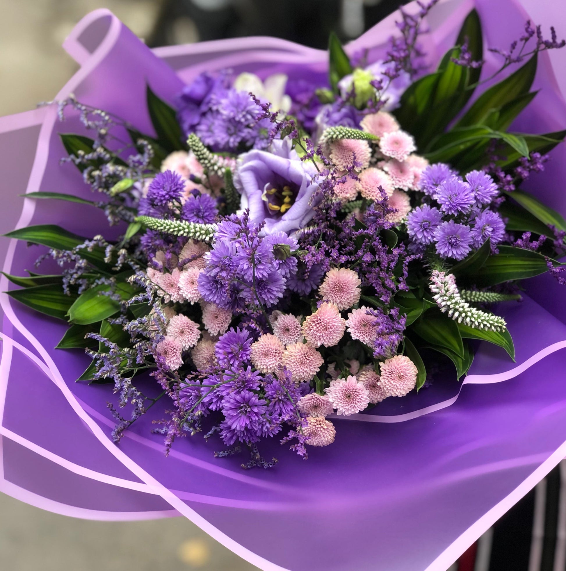 Flower Type: Limonium, Purple Eustoma, Song of Jamaica, Pink Chrysanthemum Buttons, Pink Veronica, Blue Daisy