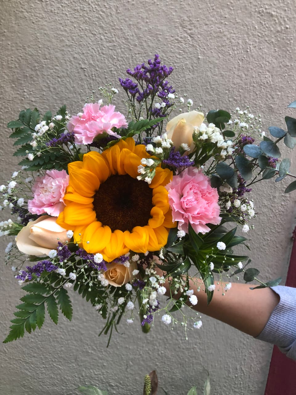 Flower Type: Sunflower, pink carnation, peach rose,fillers