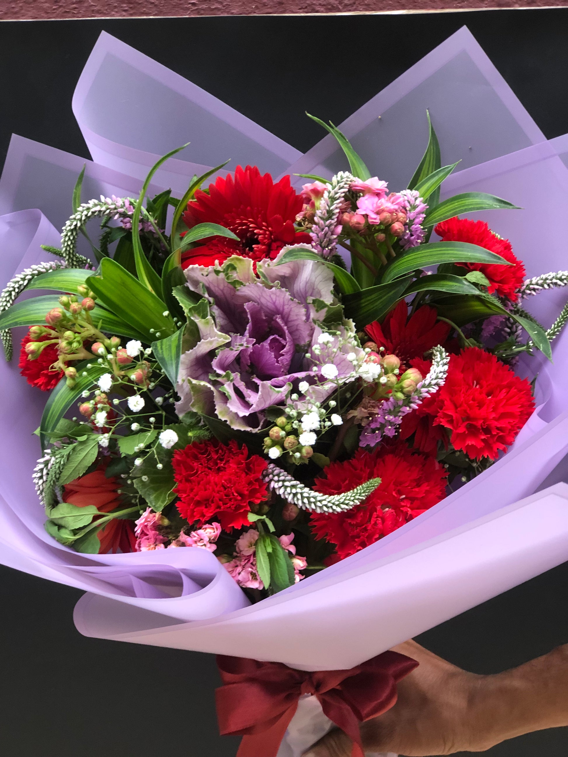 Flower Type: Brassica, red carnations, red Gerbera,kalanchoe baby's breath, and fillers