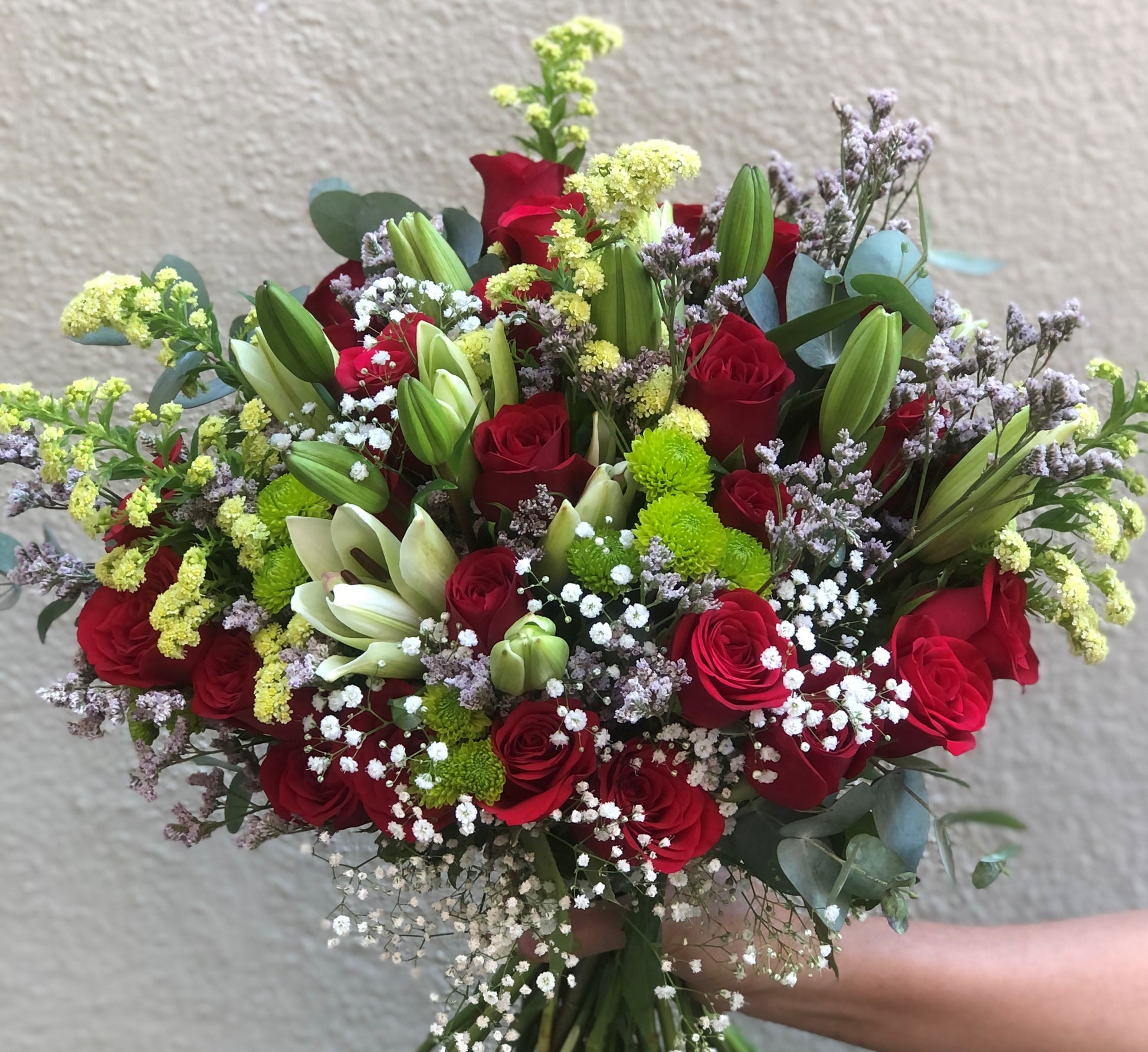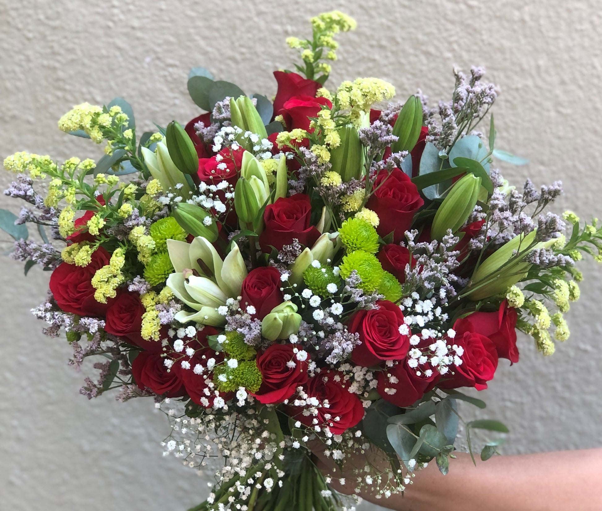 Flower Type: Red Rose, Lilly's, Green Button chrysanthemum, Gypso, Limonium, Golden road, Eucalyptus